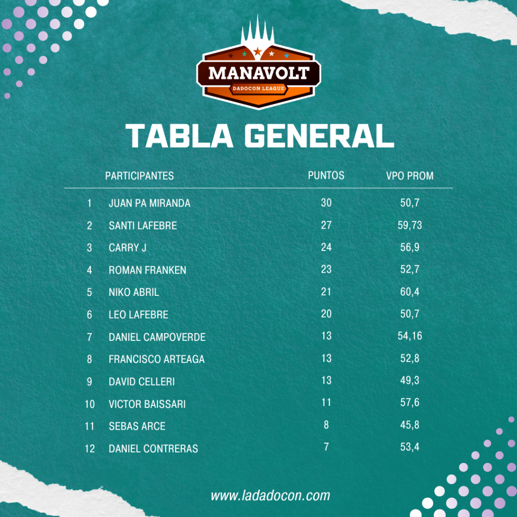 El desempeño de JuanPa Miranda ha sido simplemente extraordinario a lo largo de la liga. A pesar de no ganar la fecha, JuanPa se mantiene en el primer lugar de la tabla general, sin haber bajado del top 4 en ninguna de las jornadas. Su estabilidad y alto nivel lo consolidan como uno de los jugadores más sólidos y temidos de la competición, demostrando que, para él, la victoria no es cuestión de suerte, sino de habilidad estratégica y dominio del formato.