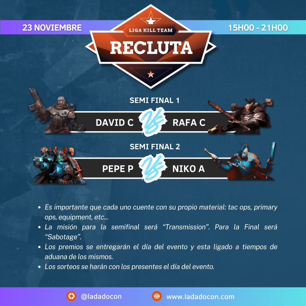 Después de semanas de emocionantes partidas, estrategias brillantes y enfrentamientos épicos, la Liga Recluta de Kill Team ha llegado a su etapa final. Este sábado, los 4 mejores comandantes se enfrentarán en las semifinales para definir quién se alzará con la victoria y se coronará como el campeón de la primera edición de la liga. Pero antes de entrar en el campo de batalla, hablamos con cada uno de los semifinalistas para conocer sus expectativas y estrategias para esta última etapa.