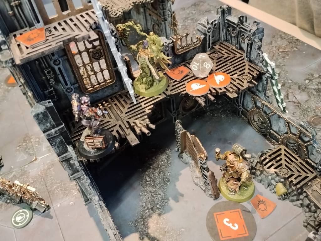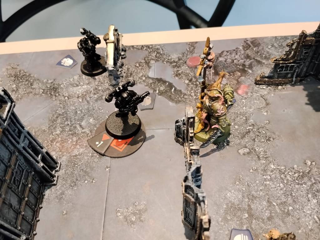 Andrés responde activando a su Sacerdote de Nurgle, intentando forzar una Kill temprana con su arma de Torrent. El plan parecía sólido… pero los dados no acompañan.
